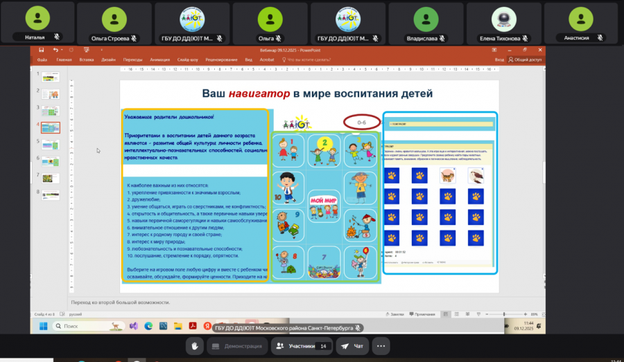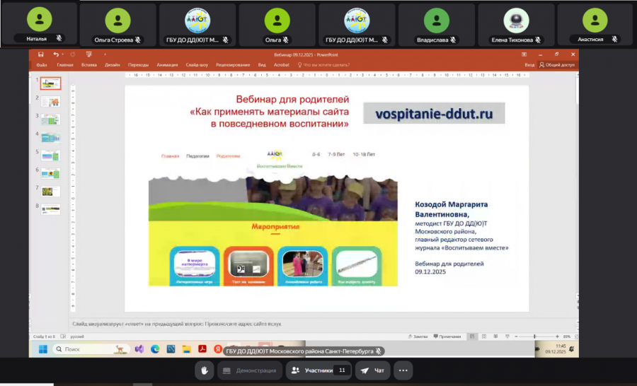 9 декабря 2025 г. на платформе Яндекс.Телемост прошел вебинар для родителей «Как применять материалы сайта vospitanie-ddut.ru в повседневном воспитании». Ведущая – Маргарита Козодой, методист и главный редактор СМИ «Сетевое издание «Воспитываем вместе» представила структурированный ресурс.