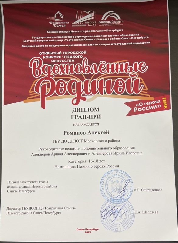 27 ноября 2025 г. в большом зале Детского творческого центра «Театральная семья» (пр. Обуховской Обороны, 121А) Невского района состоялась торжественная церемония награждения победителей и лауреатов Открытого городского конкурса чтецкого искусства «Вдохновлённые Родиной». В этом году конкурс был посвящён теме «О героях России» и прошёл при поддержке администрации Невского района.