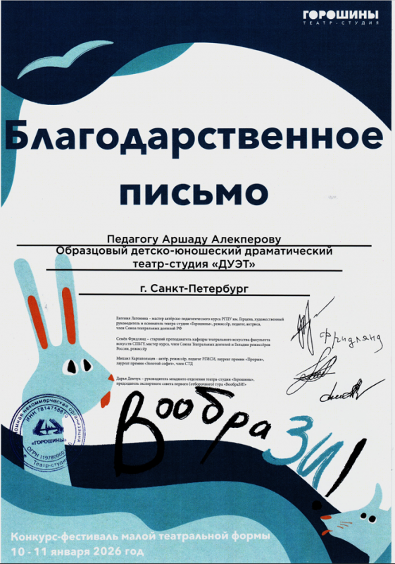 10-11 января 2026 г. образцовый детско-юношеский драматический театр-студия «ДУЭТ» принял участие в Зимних театральных играх «ВообраЗИ!», представив свои работы на суд профессионального жюри. В конкурсной программе дуэтяне показали два рассказа А. Аверченко – «Специалист» и «Обыкновенная женщина», раскрывающие тонкий юмор и психологическую глубину авторских произведений. Постановки были подготовлены под руководством педагогов Алекперова А. А. и Алекперовой И. И.