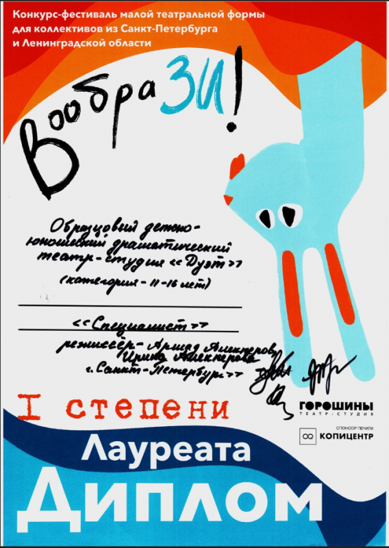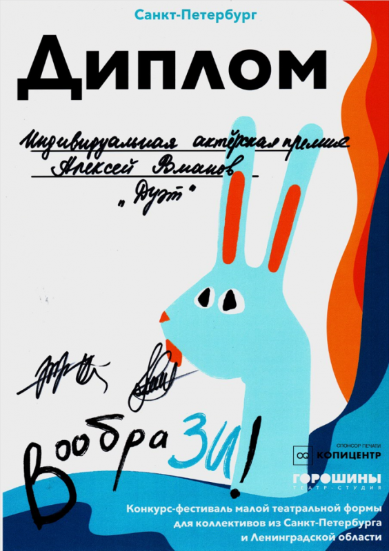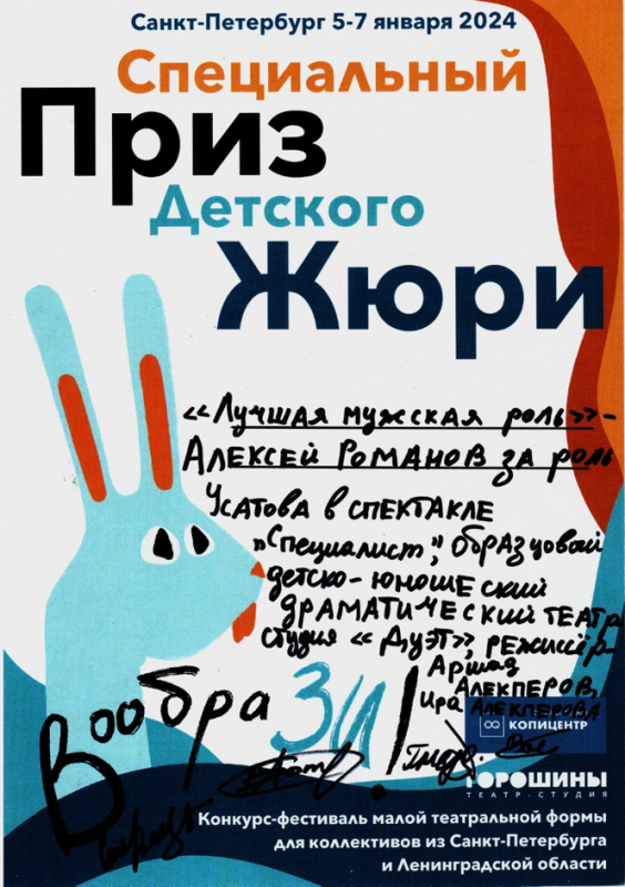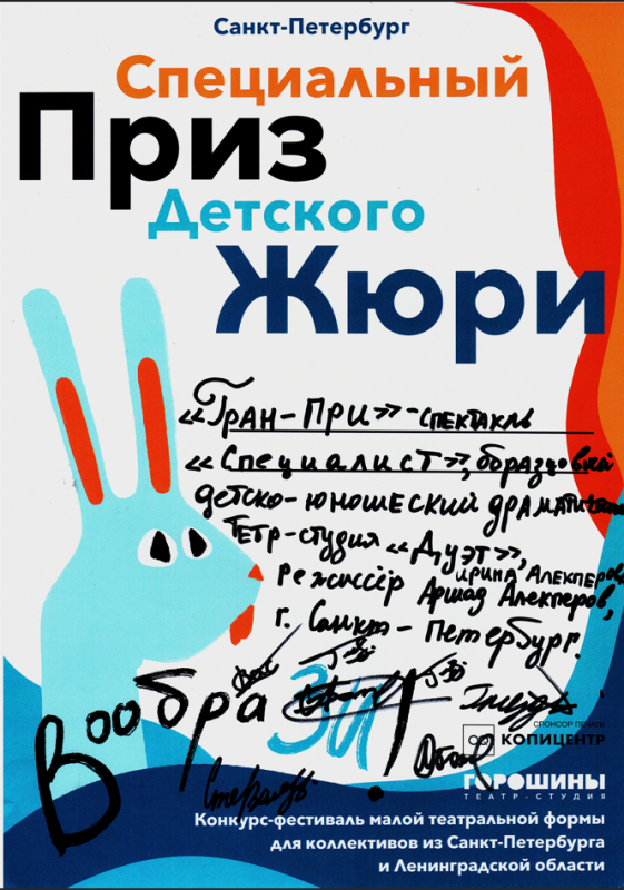 - Диплом Лауреата I степени за спектакль «Специалист»;