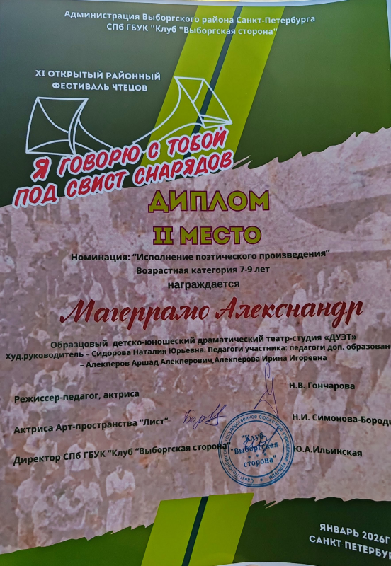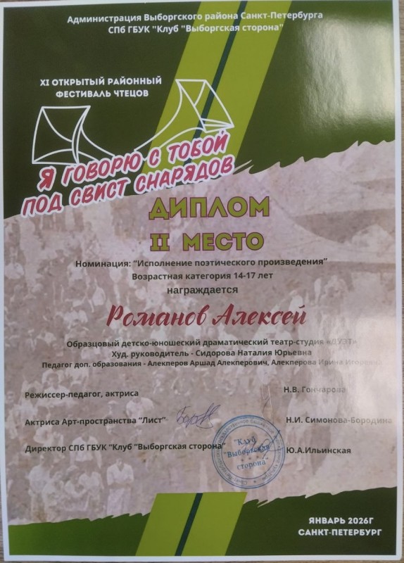 25 января гала-концертом и подведением итогов завершился XI Открытый районный фестиваль чтецов «Я говорю с тобой под свист снарядов», приуроченный ко Дню полного освобождения Ленинграда от фашистской блокады.