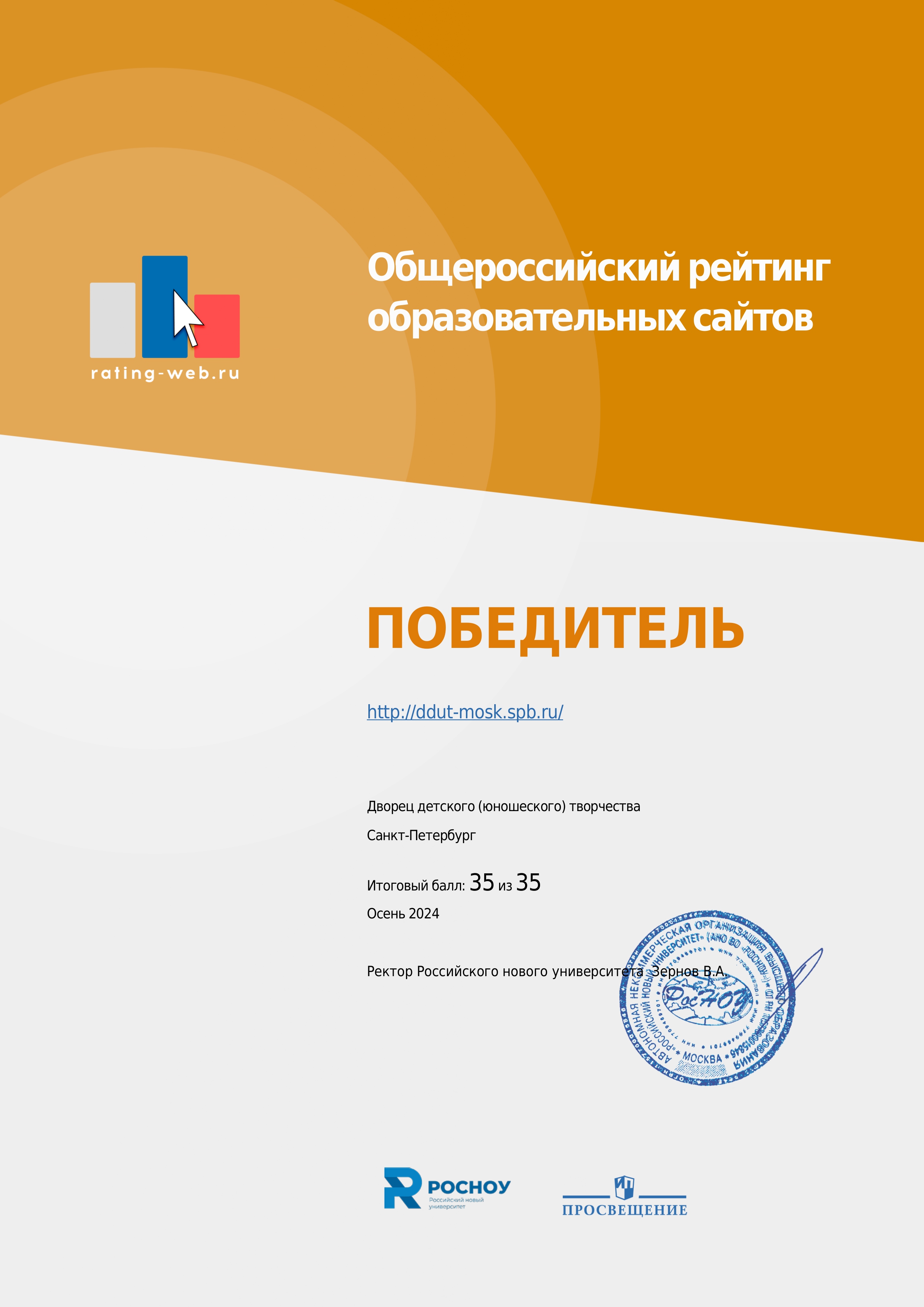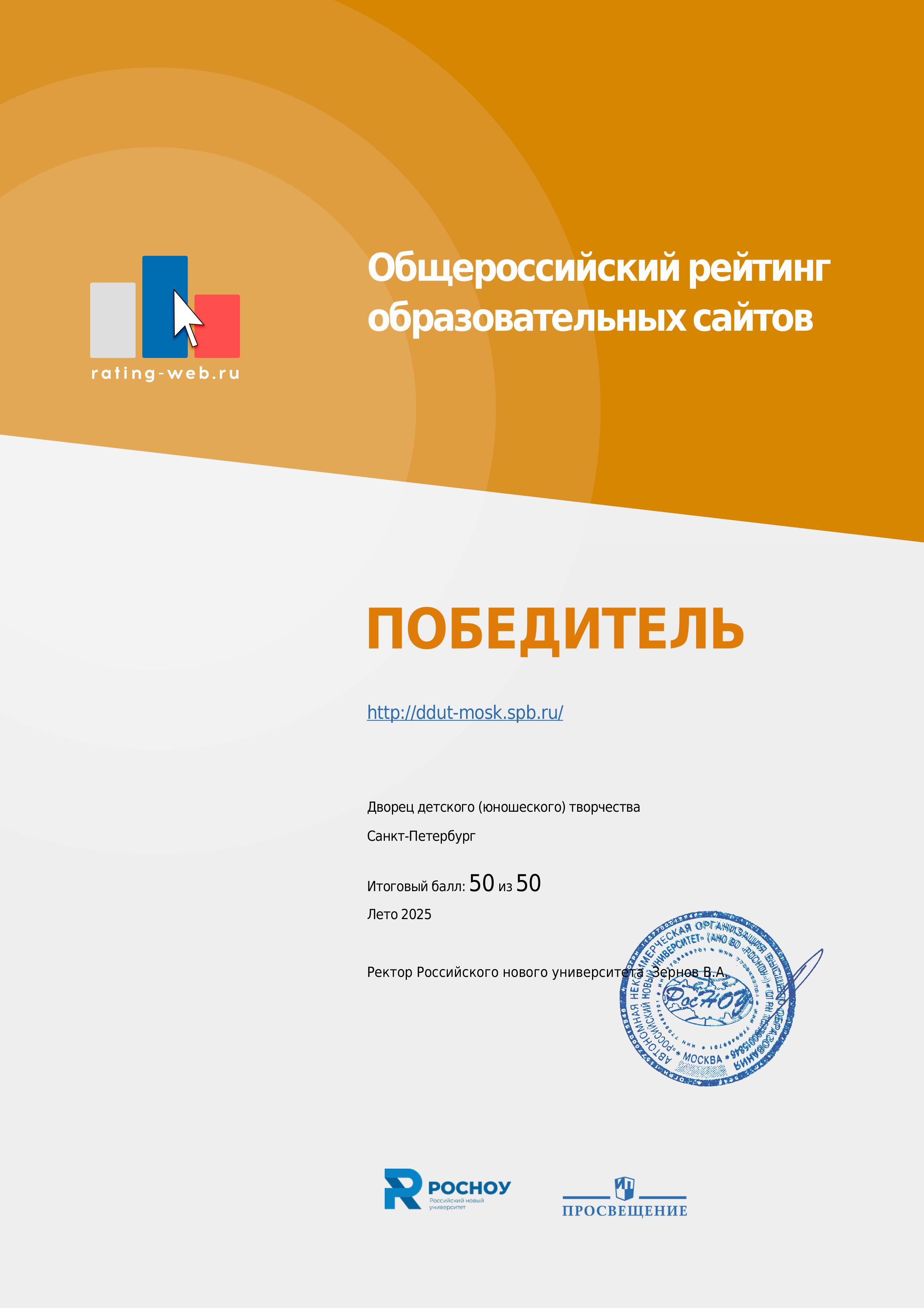 По итогам рейтинга сайт Дворца отмечен: