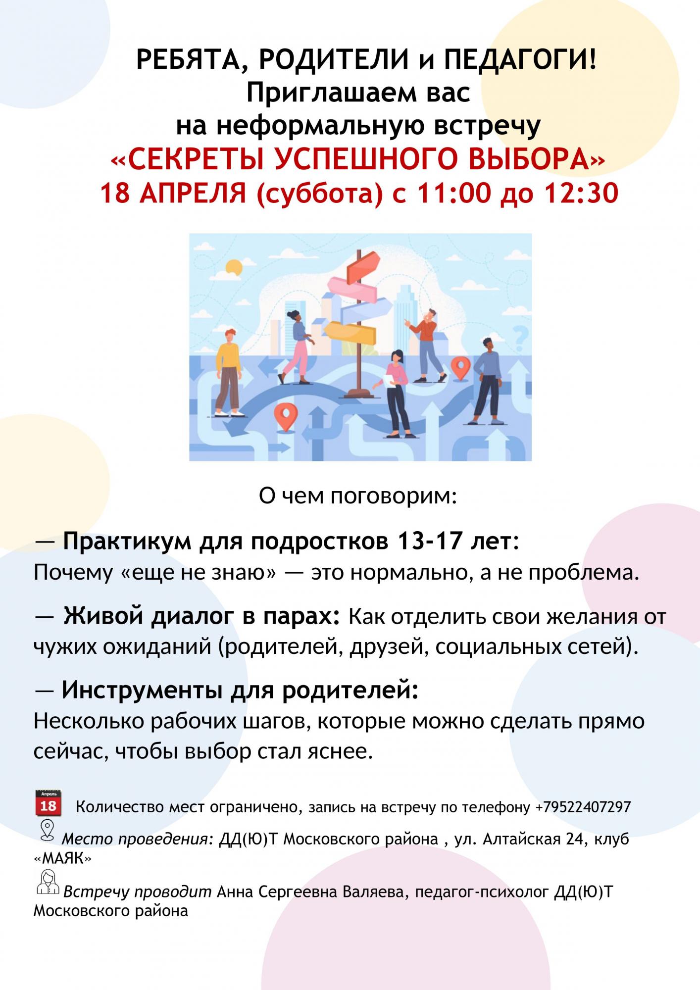 18 апреля 2026  | Интерактивная профориентационная встреча с участием родителей и детей «Секрет успешного выбора»18 апреля 2026 г. в 11.00 приглашаем на интерактивную профориентационную встречу с участием родителей и детей «Секрет успешного выбора» к участию родителей и подростков, кто уже задумывается о выборе профессии.