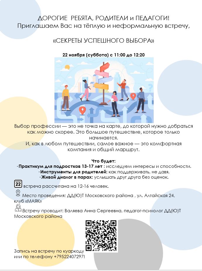 22 ноября 2025  | Интерактивная профориентационная встреча «Секреты успешного выбора» с участием детей, родителей и педагогов 22 ноября 2025 г. в 11.00 в ДД(Ю)Т Московского района (ул. Алтайская, д.24, клуб «Маяк») пройдет интерактивная профориентационная встреча «Секреты успешного выбора» с участием детей, родителей и педагогов.