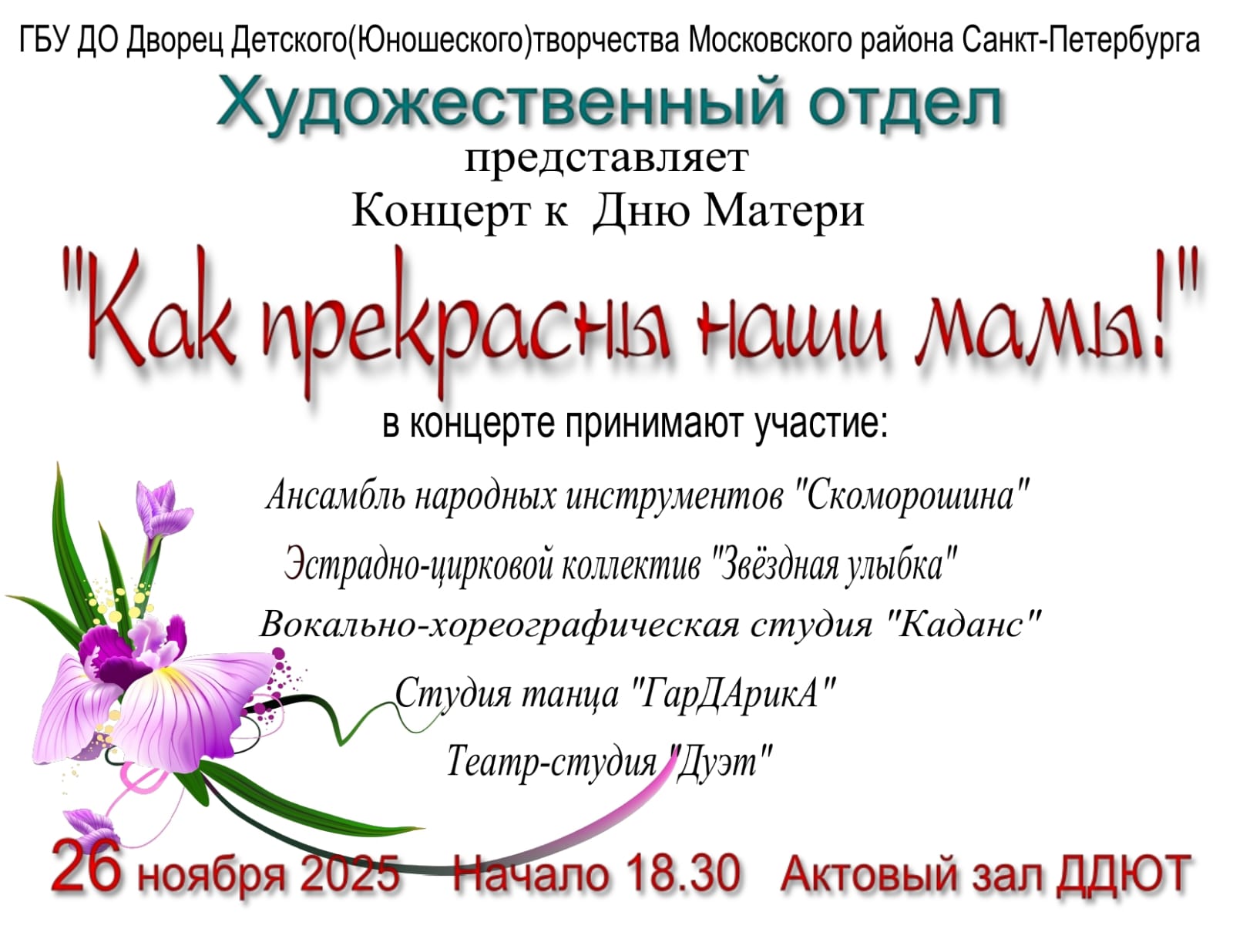 26 ноября 2025  | Концерт «Как прекрасны наши мамы», посвященный Дню матери 26 ноября 2025 г. в 18.30 в актовом зале ДД(Ю)Т Московского района (ул. Алтайская, д. 24) состоится ежегодный традиционный концерт «Как прекрасны наши мамы».