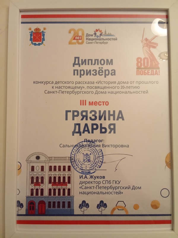 Обучающаяся клуба «Маяк» Дарья Грязина стала победителем конкурса рассказов, приуроченного к 20-летию Санкт-Петербургского Дома национальностей.