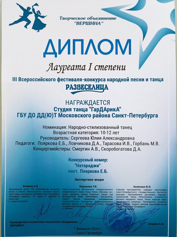 Номер «Натараджи» был удостоен звания Лауреата I степени. Постановки «Матрёшки» и «Смоленский гусачок» получили дипломы Лауреатов II степени.