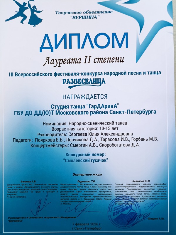 Студия танца «ГарДАрикА» ДД(Ю)Т достойно представила свою конкурсную программу, показав пять хореографических номеров и завоевав полный комплект лауреатских наград.