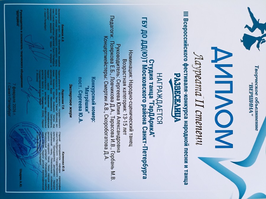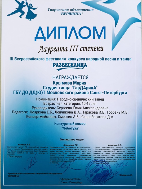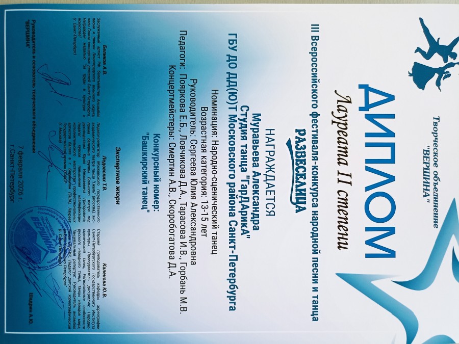 Высоких результатов добились и солисты студии. Александра Муравьёва с номером «Башкирский танец» стала Лауреатом II степени, а Мария Крымова, представившая номер «Чибатуха», – Лауреатом III степени.