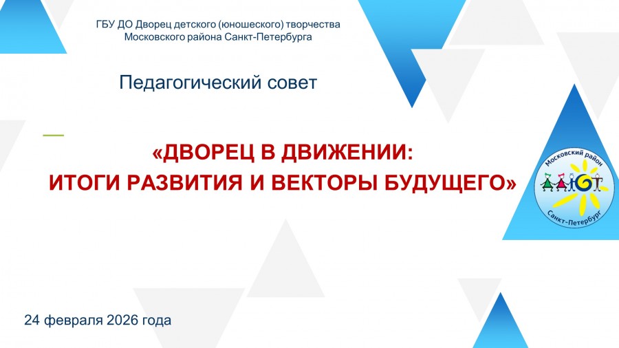 24 февраля 2026 года в ДД(Ю)Т Московского района состоялся педагогический совет, посвященный подведению предварительных итогов реализации Программы развития учреждения за 2021–2026 годы и определению стратегических ориентиров на ближайшую перспективу. В работе педсовета приняли участие педагоги, методисты, администрация Дворца и приглашенный эксперт.