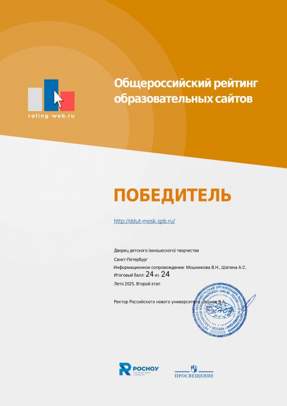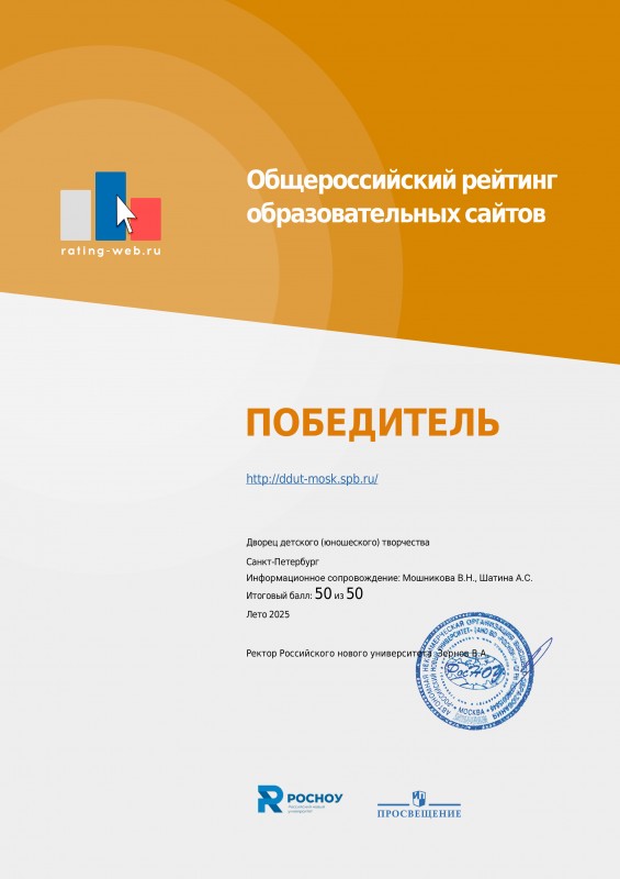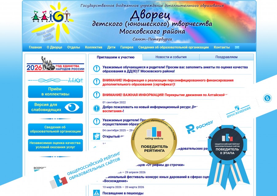 Достойно представил Санкт-Петербург и Московский район официальный сайт Дворца детского (юношеского) творчества, который не первый год участвует в рейтинге, и является многократным победителем рейтинга.