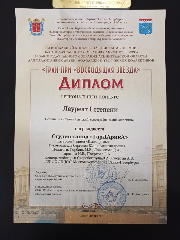 27 апреля 2026 года на сцене концертного зала администрации Калининского района состоялся региональный конкурс на соискание премии Законодательных собраний Санкт-Петербурга и Ленинградской области для талантливых детей, молодёжи и творческих коллективов «Гран-при «Восходящая звезда».