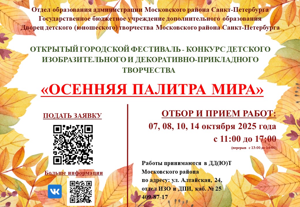 Районное учебно-методического объединение педагогов ИЗО и ДПИ «Художник - призвание и профессия: практики погружения в профессию на занятиях ИЗО и ДПИ»30 октября 2025 г. в 10.30 в ДД(Ю)Т Московского района (ул. Алтайская, д. 24, кабинет 27) состоится РУМО педагогов ИЗО и ДПИ ОУ, ДО и ОДОД. Тема встречи: «Художник - призвание и профессия: практики погружения в профессию на занятиях ИЗО и ДПИ» будет представлена педагогами Дворца в интерактивной форме.